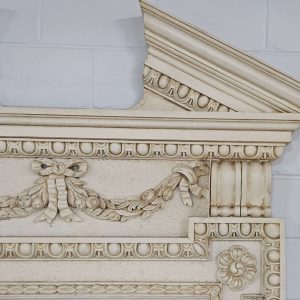 Features include a frame with slim reeded columns at the sides, supporting a carved entablature featuring reeding and ogee mouldings. Above the columns are carved foliate bosses, and there is a central cartouche. This has a finely carved fabric swag.