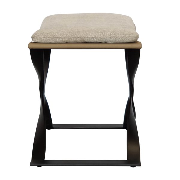 A very comfortable stool which has a gently curved, and bronzed metal base, with an interesting twist.