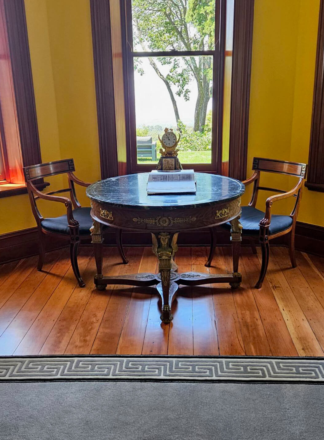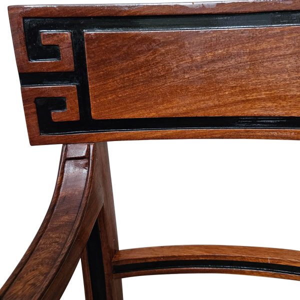The gracefully curved tablet back has a recessed and ebonized Greek key motif. Hand carved paw feet complete the scrolled and carved arms, above paterae and sabre legs.