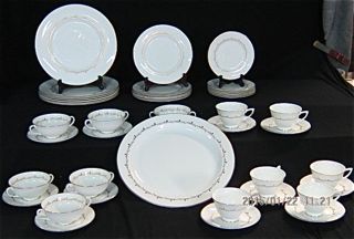 The set comprising of 6 dinner and 5 smaller, 6 bread and butter (dia’s 27,20.5, 16.5 cm) and 6 soup dishes dia 14.5, 6 cups 11 saucers and a large charger dia.33.5 cm. 41 pcs