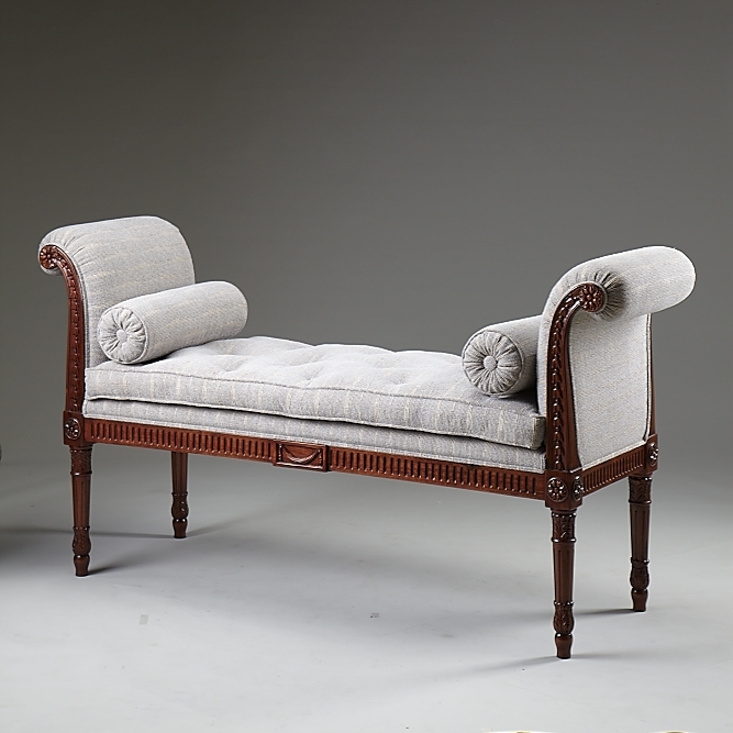 A particularly fine Late George III example (Circa 1785 – 1790) was the inspiration for Classic Chair’s craftsmen to produce this wonderful copy. Although the original is English, it does have a French look as well, and could be used in almost any interior, sometimes used as an end of bed stool, sometimes as a hall bench. Each harebell flower, swag drape, flute, patera and leaf is individually hand carved with exactly the same precision as the original. The squab cushion, covered in your choice of fabric, is filled with feather and down stuffing and is reversible.
