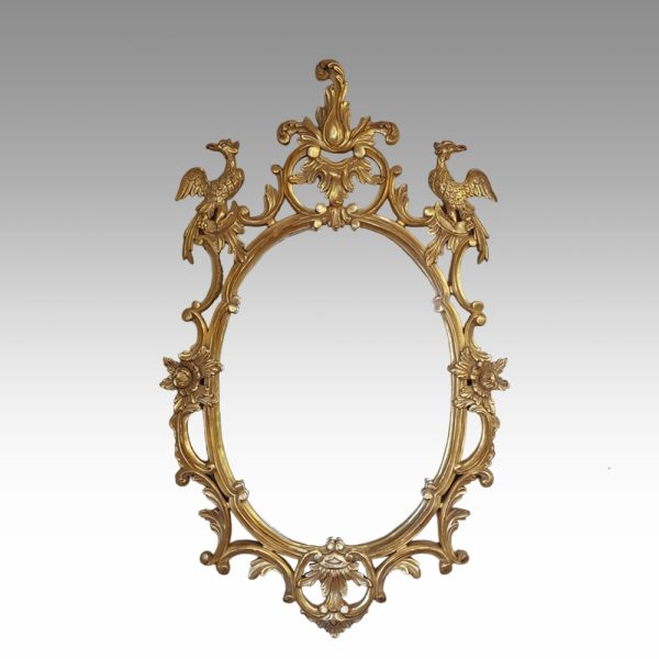 The mythical Ho-Ho bird is featured on this delightful oval mirror. All hand carved from solid wood, the scrolling foliate branches surround an oval plate mirror. Originals of these mirrors are scarce and expensive and date from 1750 to 1775. As with all hand carved Classic Chairs mirror, this Ho-Ho bird mirror can be ordered with a gilded finish, or a distressed painted decoration or polished wax wooden finish, limed or natural.