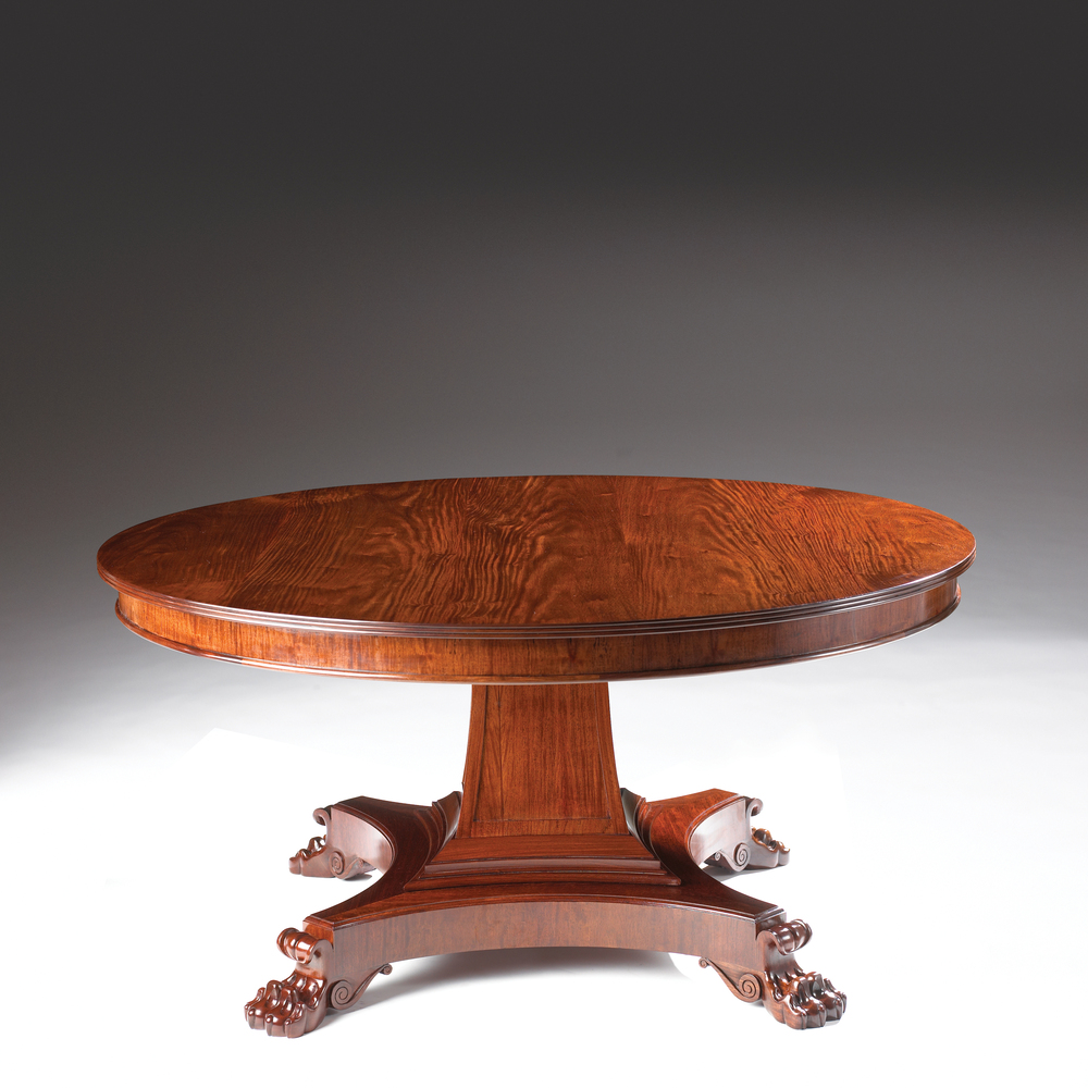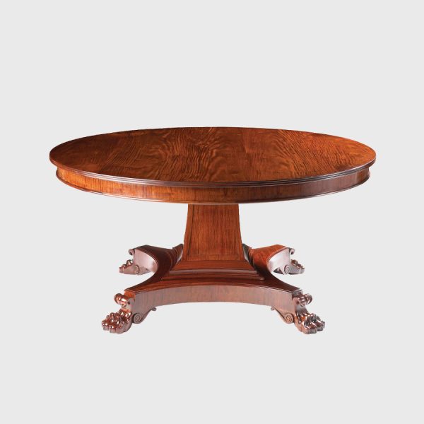 One of the most difficult to find and expensive antique has always been the large round dining table Classic Chairs has the solution with the beautifully made and stylish Robert Jupe circular table. The quadriform base with hand carved paw feet complete this very robust and pleasant table. The Table is designed to seat up to 8 people.