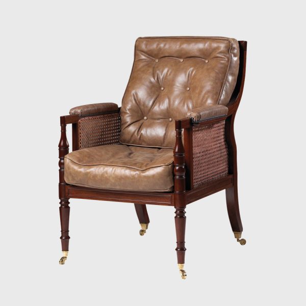 This handsome copy of an English Regency bergere has a rosewood frame perfectly complemented by the caned seat, sides and back and upholstered with comfortable cushions filled with feather and down stuffing. The deep seat and stylish scroll of the back designed for good lumbar support, combined with the graceful turned front legs and sabre back legs, makes the chair an elegant addition to any setting.