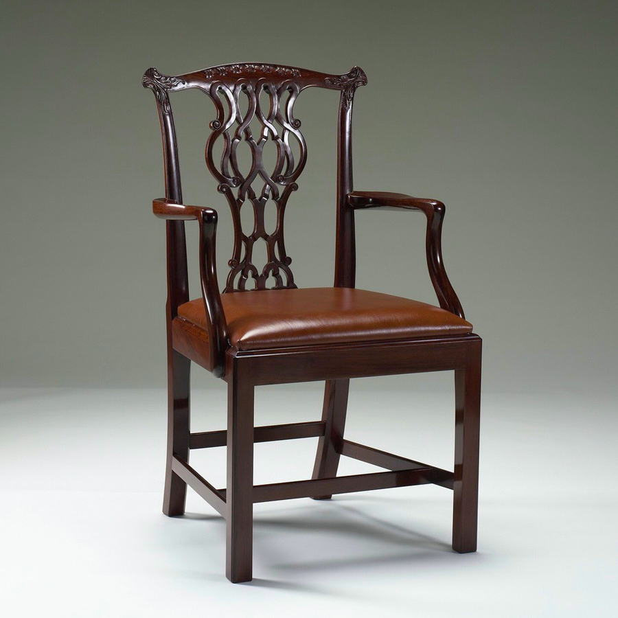With the typical yoke rails, carved “ears” and the intricately carved back splat, this Provincial Chippendale chair has all the hallmarks of having been originally inspired by Thomas Chippendale’s pattern book.